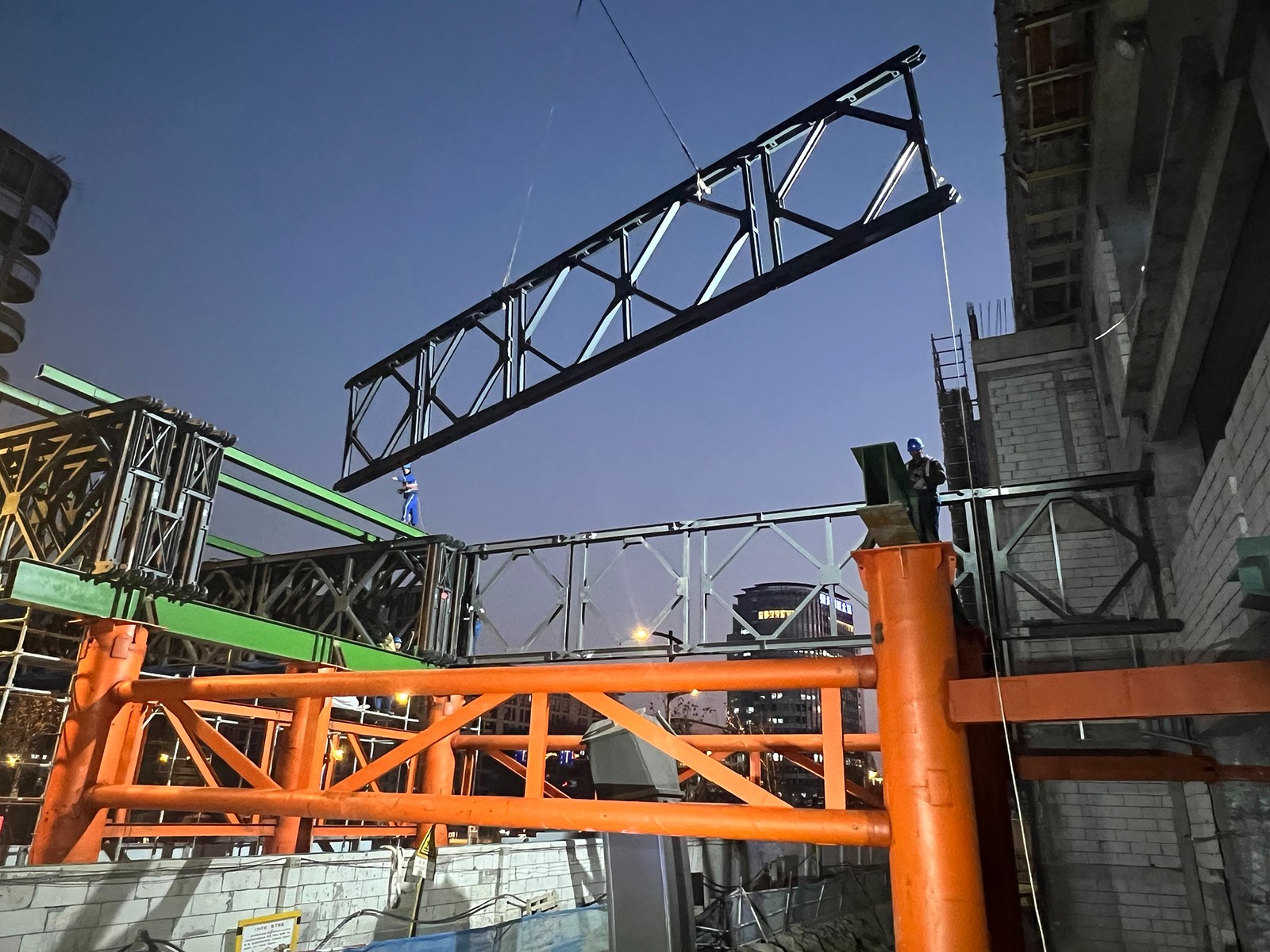 利用围挡与建筑主体间的狭长空间提前完成XT300桁架的拼接工作;2024年1月15日凌晨,使用汽车吊将4组8片、跨径40m的XT300桁架分片吊装,只用一个晚上就完成了跨主干道的桁架架设任务;