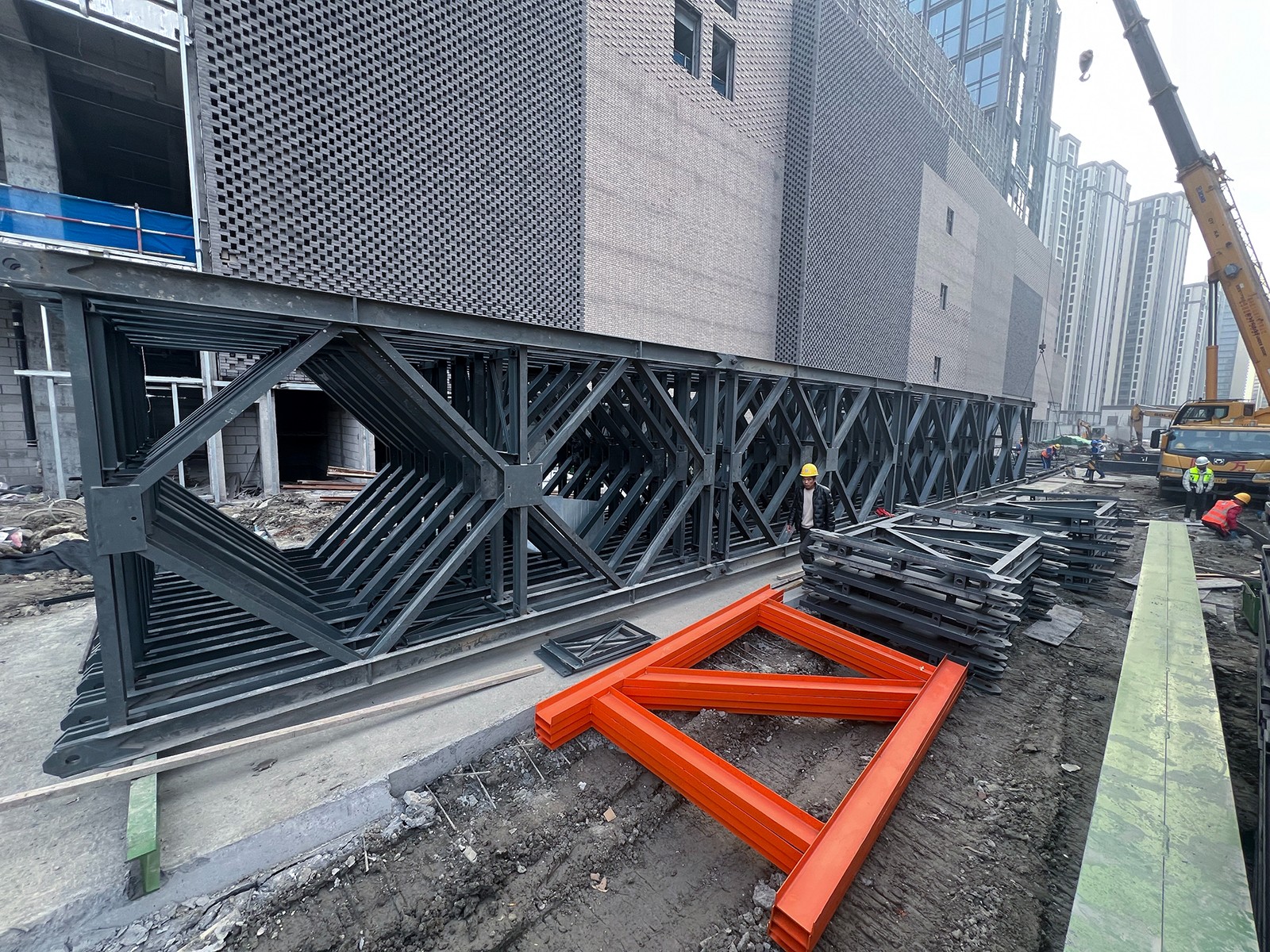 空中廊桥采用了钢结构钢管桁架的设计,全长72.5米,宽6至12米,中心底部距地面达12.5米,既保证了行人通行的便捷性,又赋予了整个建筑独特的视觉美感使其成为城市中一道亮丽的风景线。
