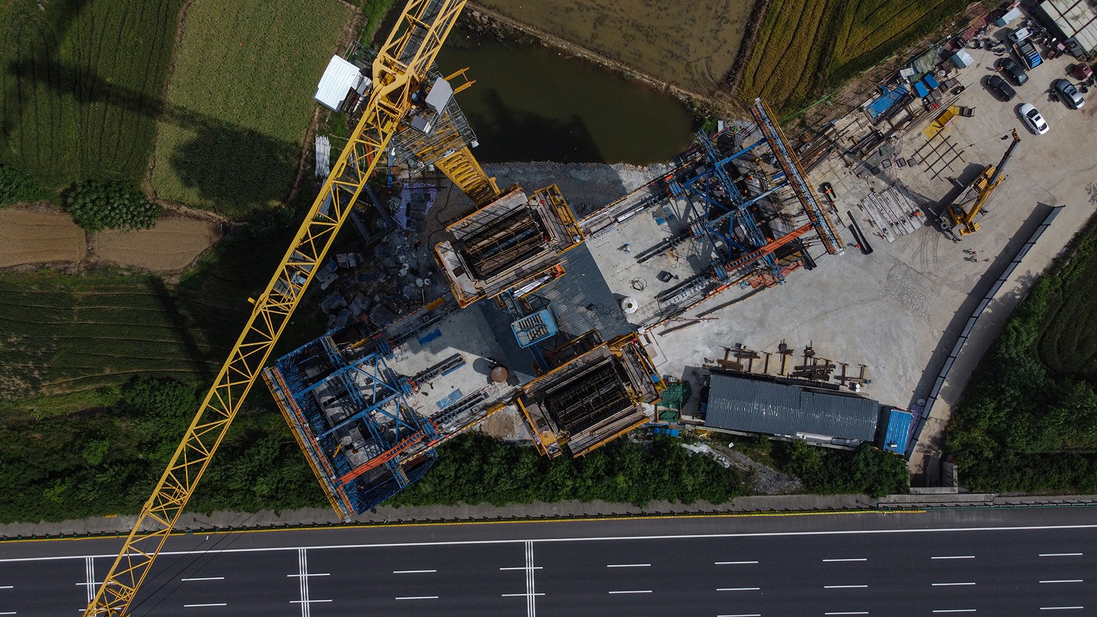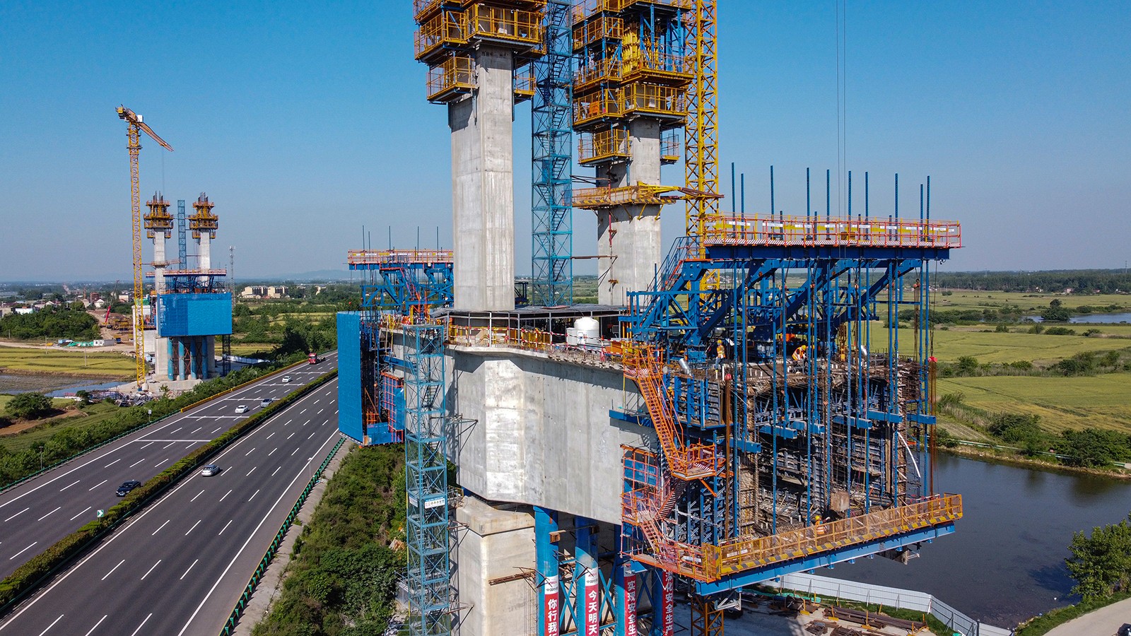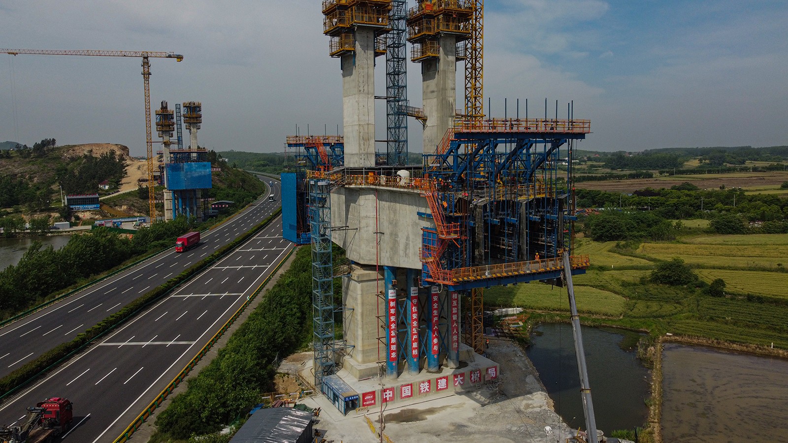 跨沪陕高速公路特大桥总长20.8公里,其中主桥自西北向东南斜跨沪陕高速公路,与高速公路斜交24度,是上海至南京至合肥高铁安徽段重难点工程。跨沪陕高速公路立交特大桥桥长497米,设计为双塔双索面预应力混凝土斜拉桥,主桥孔跨为(32+93+240+93+32) 米,为国内铁路同类型单跨最大跨度的矮塔斜拉桥,采用挂篮悬臂浇筑法施工,具有桥梁跨度大、节段数量多、施工周期长、安全风险高等特点。